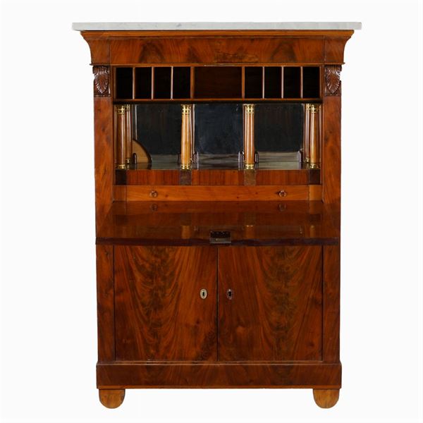 fronte ad un cassetto, due sportelli e calatoia con all'interno cassetti e scomparti vari delimitati da colonnine tornite con terminali in bronzo dorato e cesellato, piano in marmo bianco di Carrara, 148x104x44 cm.