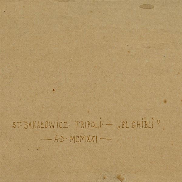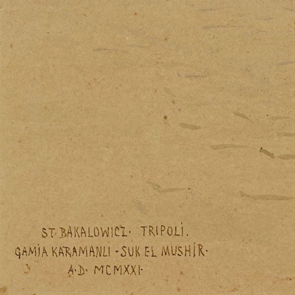 " El Ghibli - Gamia Karamanli Suk el Mushir", coppia di acquarelli su carta, titolo, firma e data Tripoli MCMXXI in basso a sinistra, entro cornici, 31x45,5 cm.