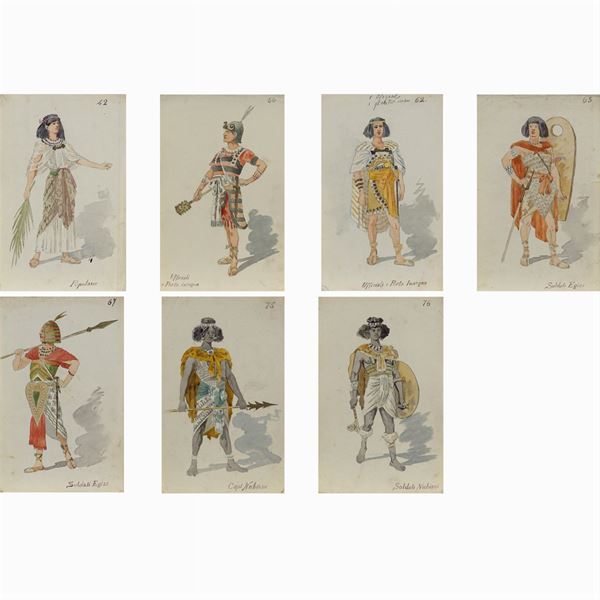 19 figurini per la rappresentazione dell'opera "Aida"di Giuseppe Verdi su libretto di Antonio Ghislanzoni, matita, acquarello e tempera dorata su carta, numerati in alto a sinistra, titoli in basso, alcuni con annotazioni a matita sul fronte, difetti, 30x19 cm.
