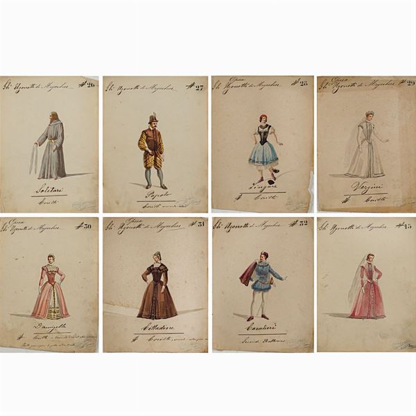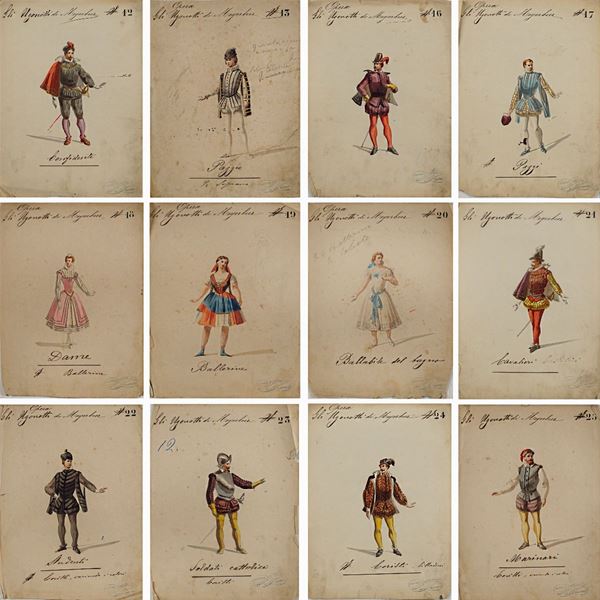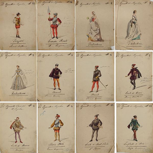 32 figurini per la rappresentazione dell'opera di Giacomo Meyerbeer, china e acquarello su carta, annotazioni a china sul fronte, timbri della Sartoria Teatrale Brunetti Chiappa, Milano, difetti, 28x23 cm.