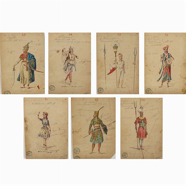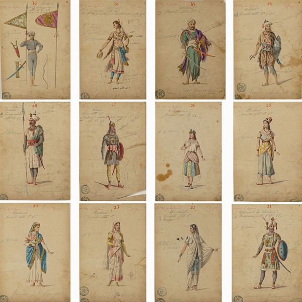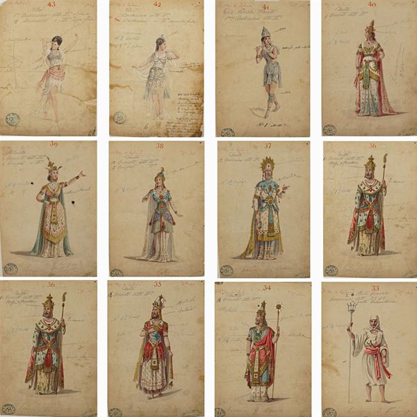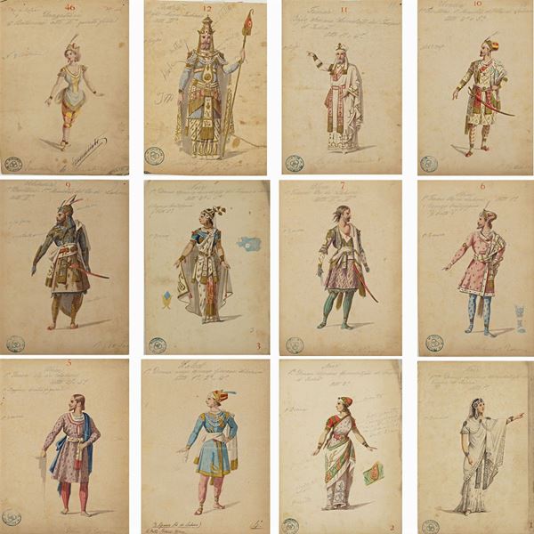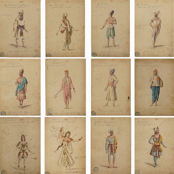 56 figurini per la rappresentazione dell'opera "Il re di Lahore" di Jules Massenet su libretto di Louis Gallet, tecnica mista su cartoncino, annotazioni sul fronte, alcuni con annotazioni a matita sul retro, timbri Ricordi Milano e tracce di timbri Luigi Bartezago sul fronte, difetti, 31x21,5 cm.