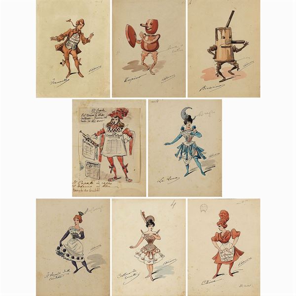tra cui "Liquore China Carpano", "Gazzetta del Popolo" e "Il venerdì della Contessa", tecnica mista su cartoncino, firmati 'Caronte' in basso a destra, lievi difetti, 23x18 cm.