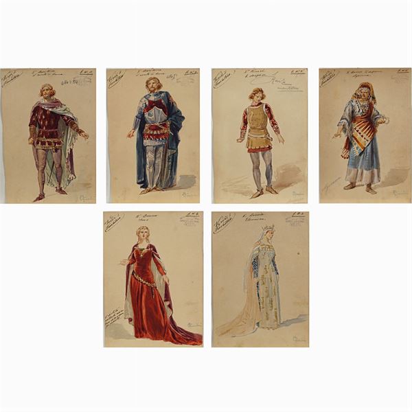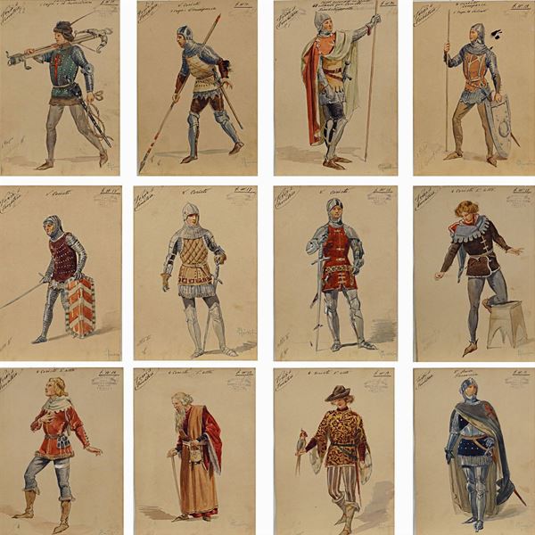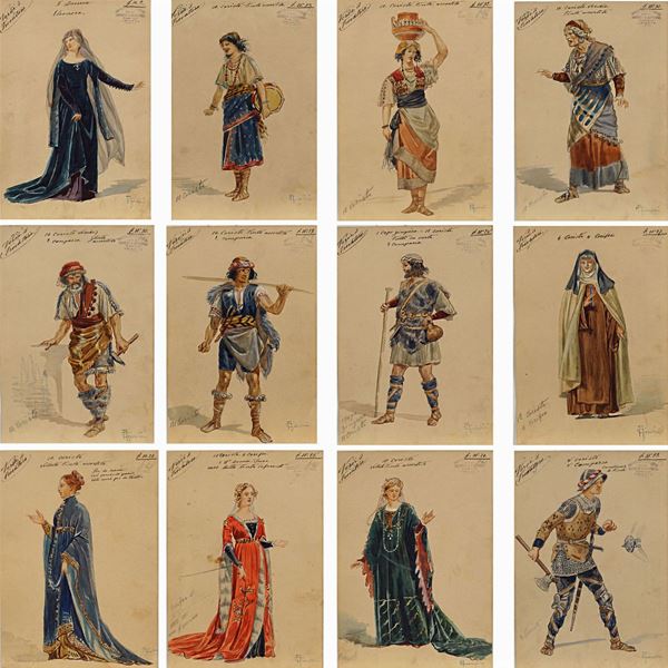 31 figurini per la rappresentazione dell'opera "Il Trovatore" di Giuseppe Verdi su libretto di Salvadore Cammarano, tempera, matita e china su cartoncino, annotazioni sul fronte, firma in basso a destra, alcuni timbrati Sartoria Teatrale Triestina, Hofstatter & Bonaventura Trieste, lievi difetti, 36,5x24,5 cm.