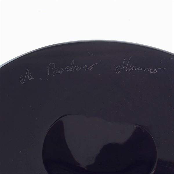 vaso in vetro nero modellato a foggia di borsetta con inclusioni in oro, firmata sotto la base, h. 29,5 cm.