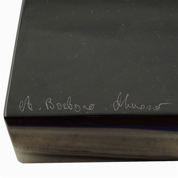 scultura in vetro trasparente e policromo, poggiante su base nera di forma geometrica, firmato sulla base, 64x37 cm.