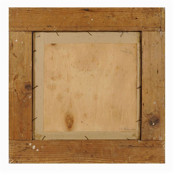 "Baita di montagna", olio su tavola, firmato e datato 1922 in basso a destra, entro cornice, 38x38 cm.