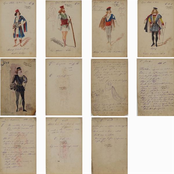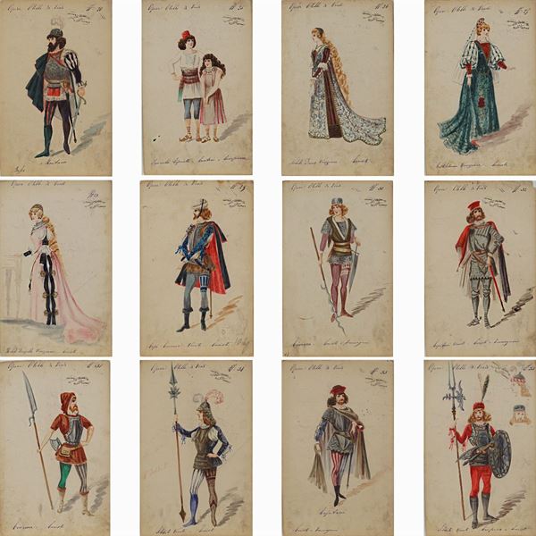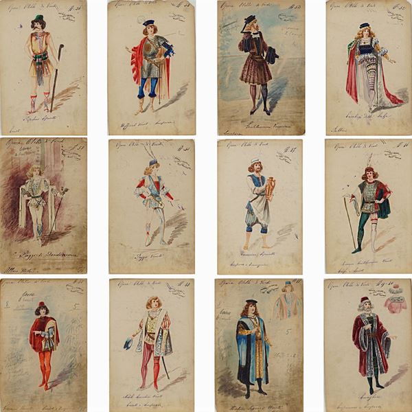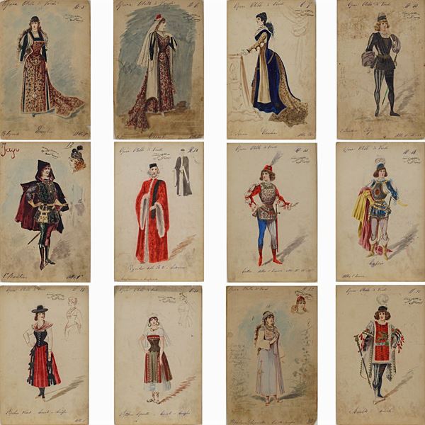 41 figurini per la rappresentazione dell' opera "Otello" di Giuseppe Verdi su libretto di Arrigo Boito, tempera, matita acquarellata e china su cartoncino, annotazioni autografe per la sartoria sul fronte e sul retro, timbri de La Sartoria Teatrale Brunetti Chiappa, Milano, alcuni timbrati G.Ricordi & C., Milano, difetti, 34,5x22 cm.