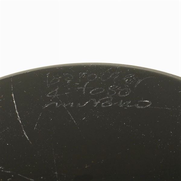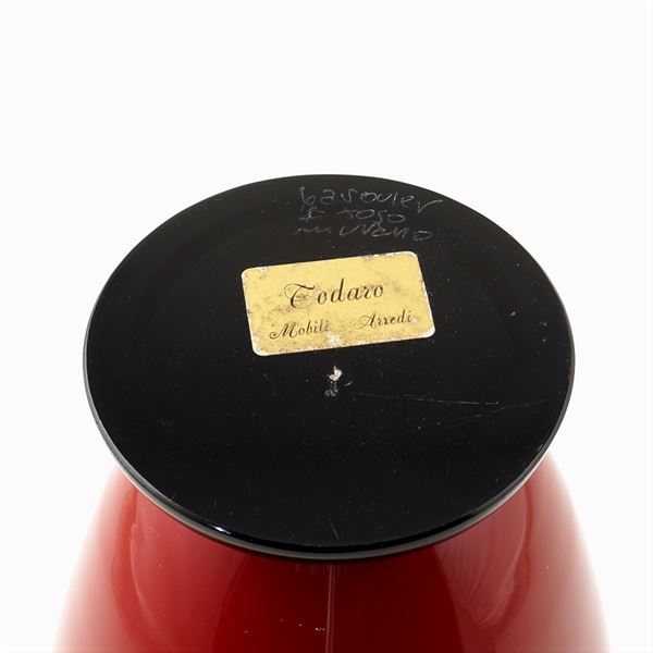 coppia di vasi a campana in vetro nella tonalità del rosso e del nero, basi circolari, firma incisa sotto la base, una reca etichetta adesiva, h. 32,5 - 24,5 cm.