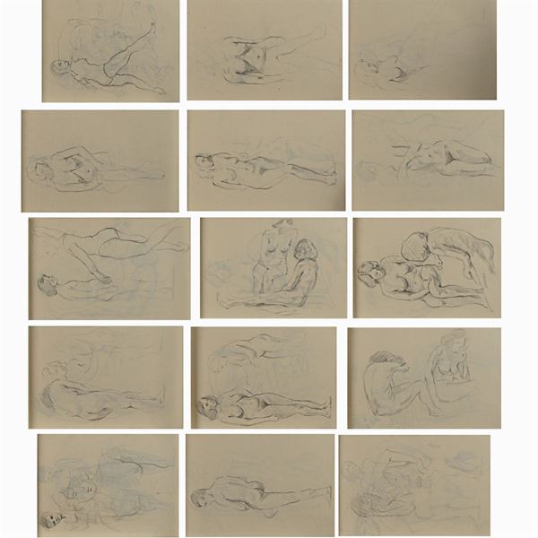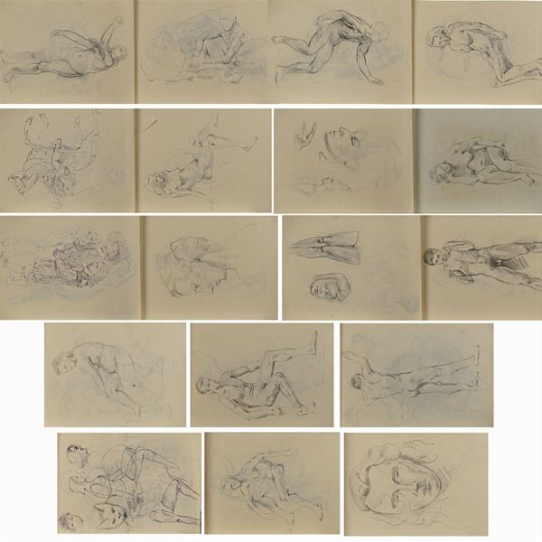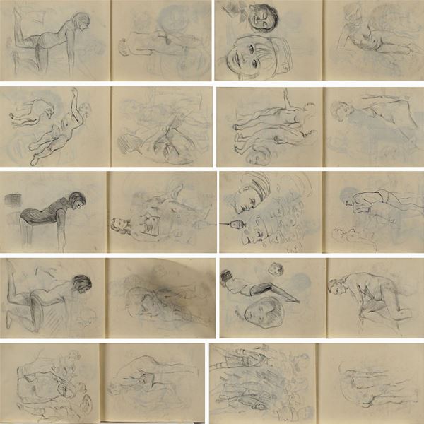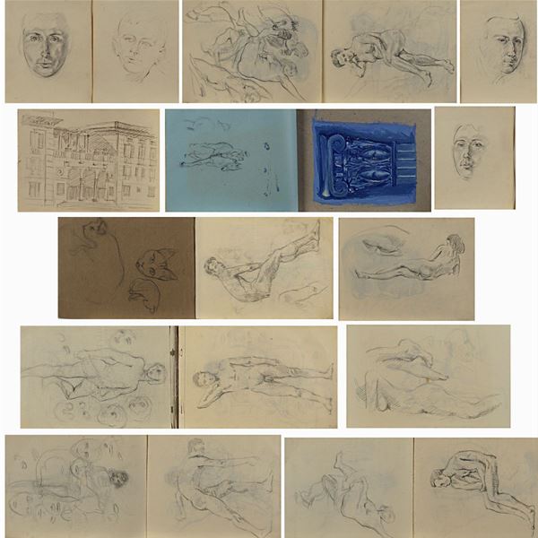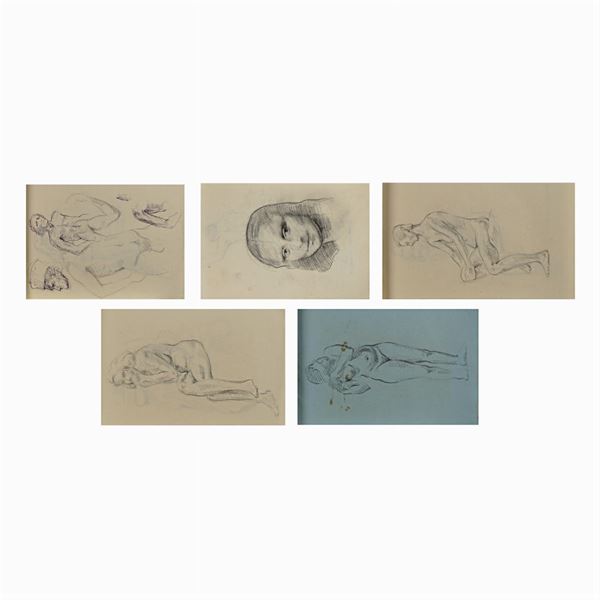 raffiguranti studi di nudo e ritratti, matita e matite colorate su carta Fabriano, lievi difetti, 25x35 cm.