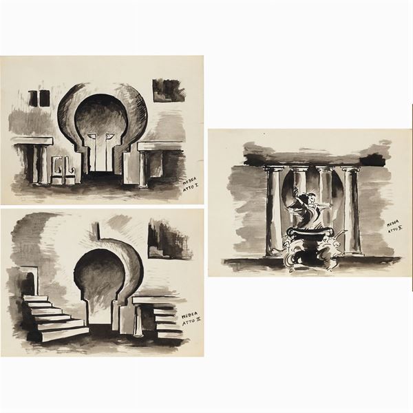 3 bozzetti scenografici, tempera su carta, in basso a destra le diciture "Medea Atto I", "Medea Atto II" e "Medea Atto III", lievi difetti, 24x33 cm.