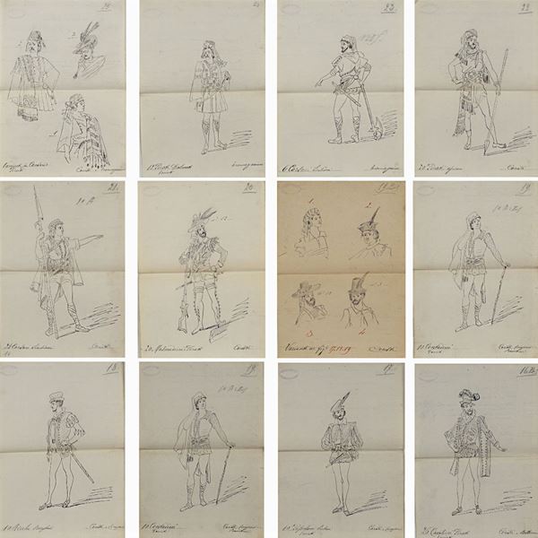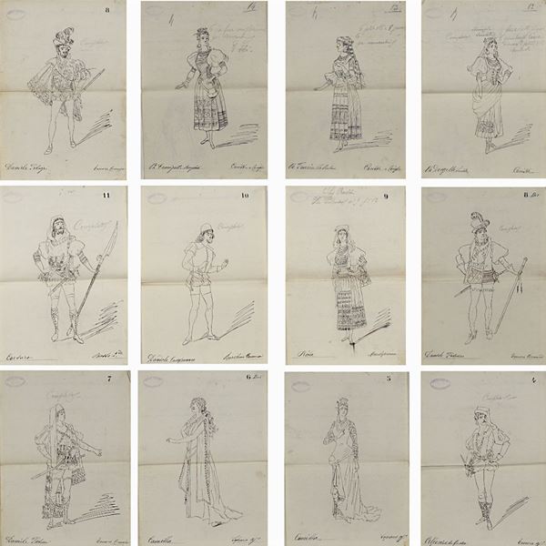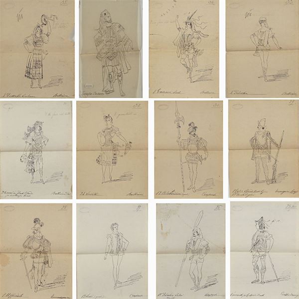 37 figurini e un lucido per la rappresentanzione dell' opera " Zampa, ossia la Sposa di Marmo" di Ferdinand Herlod, tratti dai disegni di Alfredo Edel, china su carta e carta lucida, numerati in alto a destra, annotazioni per la sartoria al retro, timbri Cesare Razzani scenografo scenotecnico, difetti, 40x28 cm.