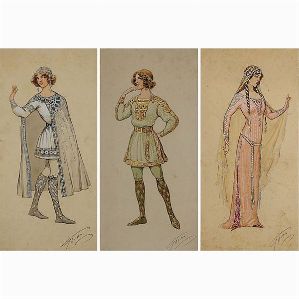 4 figurini per una rappresentazione teatrale, acquarello e tempera su carta applicata su cartoncino, firmati in basso a destra, annotazioni al retro, difetti, 45,5x26 cm.