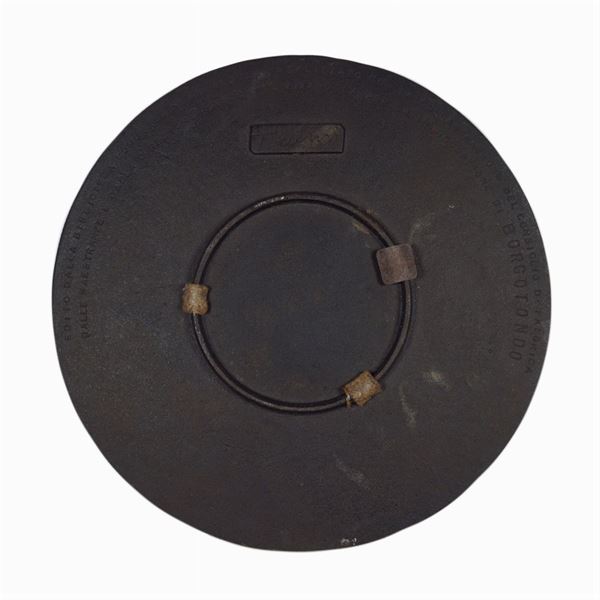 piatto in ghisa, firmato sul retro. Edito dalla Biblioteca comunale di Mirandola e realizzato per l'inaugurazione di Borgotondo, d. 35 cm.