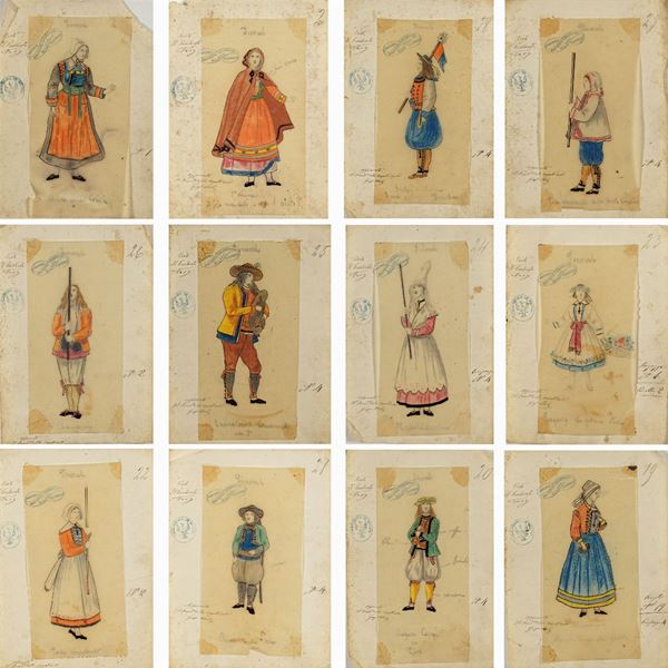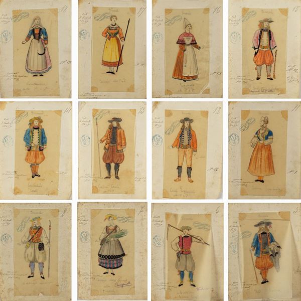 26 figurini per la rappresentazione dell'opera di Giacomo Meyerbeer, tempera, matita e china su carta velina applicata su cartoncino, annotazioni sul fronte, timbri della Sartoria Brunetti Chiappa, Milano e un timbro non riconoscibile, difetti