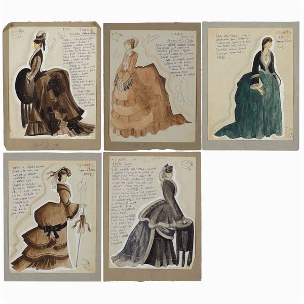 6 figurini per la commedia teatrale di Achille Torelli, matita, tempera e china su carta applicata su cartoncino, annotazioni sul fronte, difetti, 31,5x24 cm.