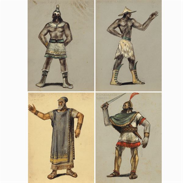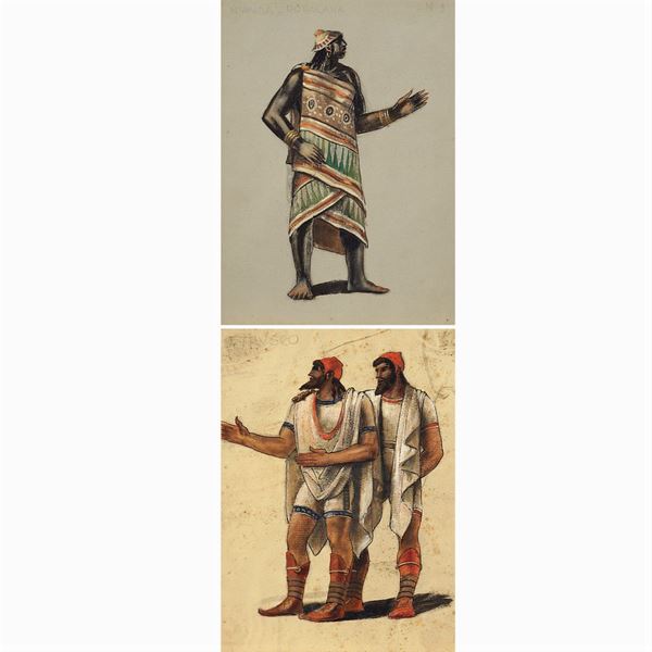 6 figurini per la rappresentazione dell'opera di Hector Berlioz, tecnica mista su carta applicata su cartoncino, annotazioni a matita sul fronte, difetti, 35,5x33 cm.