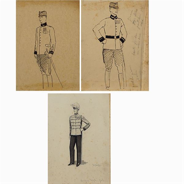 4 figurini raffiguranti soldati in divisa, china e tempera su carta, annotazioni sul fronte e disegni al retro, 2 firmati F. Carafa, difetti, 40,5x28 cm.