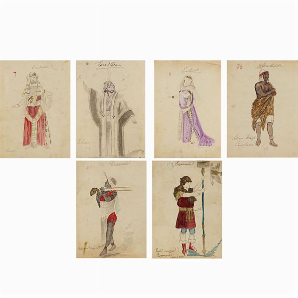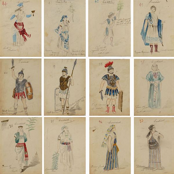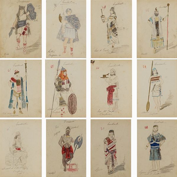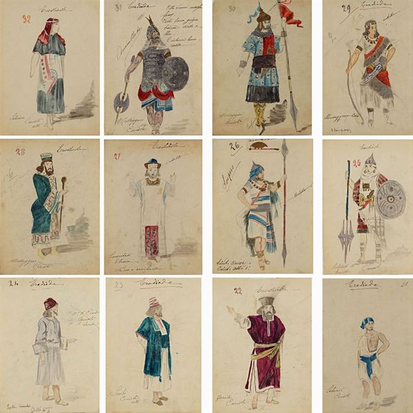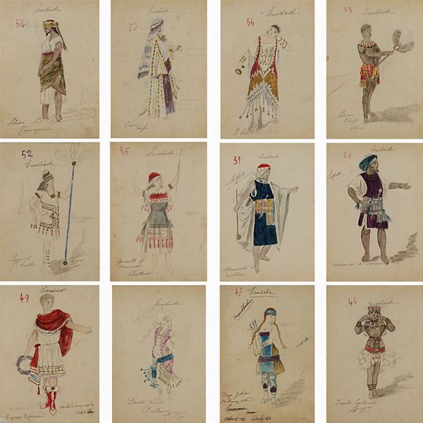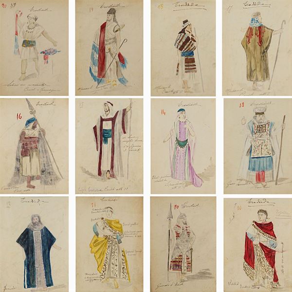 67 figurini per la rappresentazione dell'opera di Jules Massenet su libretto di Paul Milliet e Henri Grémont, tecnica mista su carta applicata su cartoncino, annotazioni sul fronte, annotazioni per la sartoria sul retro, difetti, 30x21 cm.