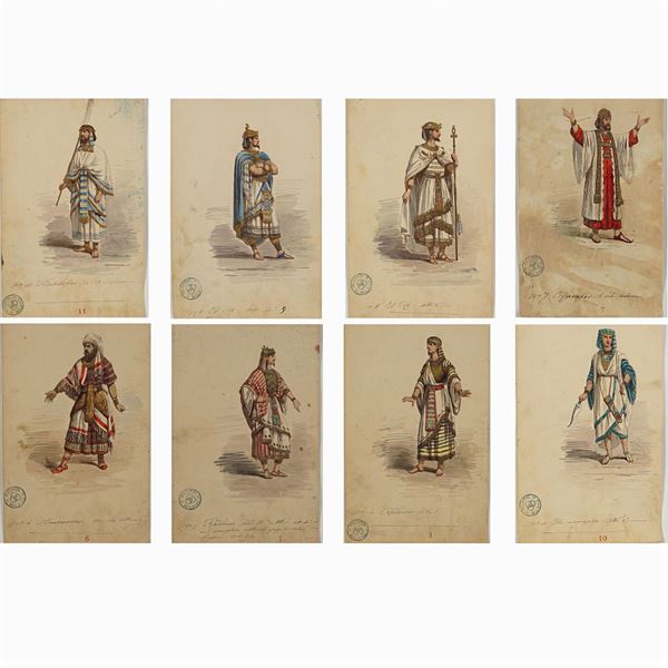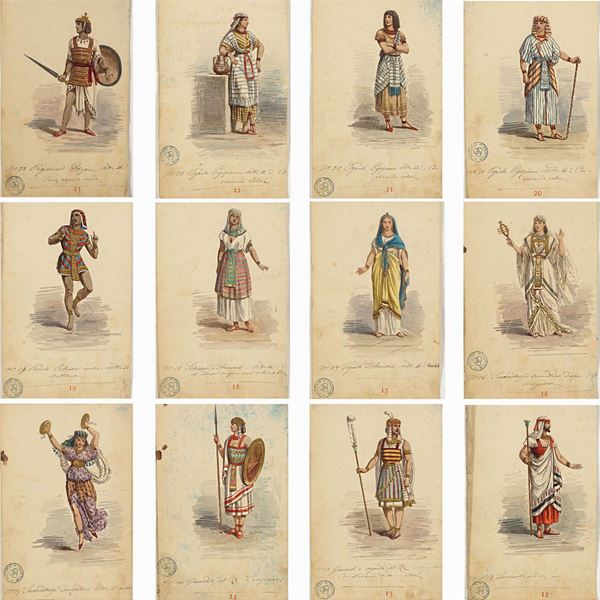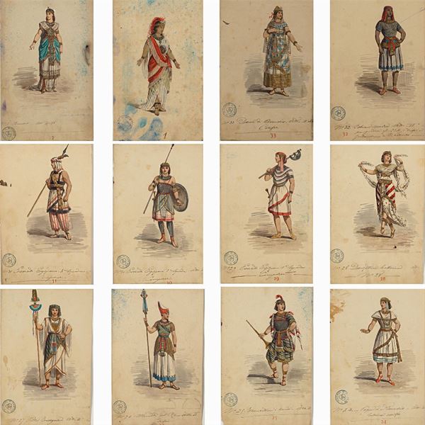 33 figurini per la rappresentazione dell' opera di Giuseppe Verdi, matita, acquarello e tempera dorata su cartoncino, annotazioni sul fronte, timbri Ricordi, Milano sul fronte, difetti, 31x19 cm.