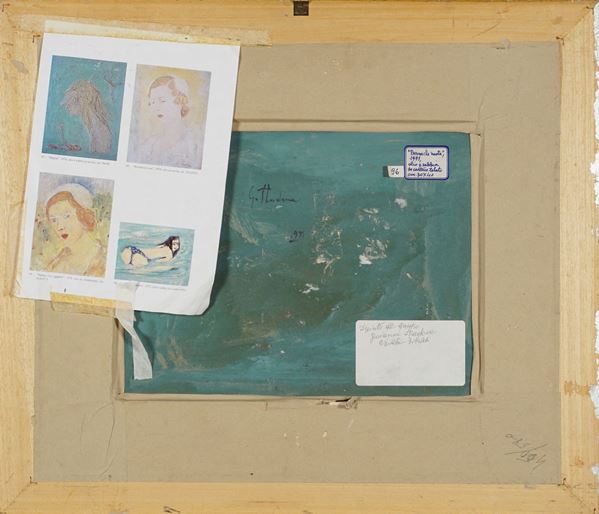 "Donna che nuota", 1971, olio e sabbia su cartone telato, firmato e datato sul retro, entro cornice. Autentica di Wanda Tibaldi su foto