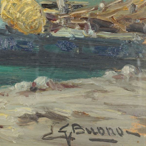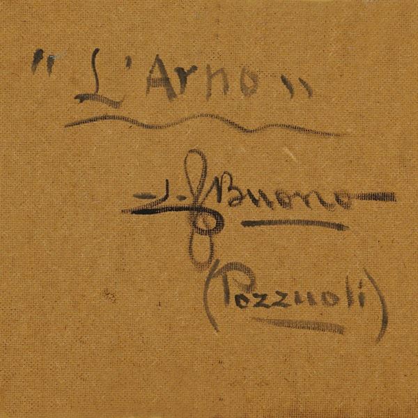 "L'Arno", olio su masonite, firmato in basso a destra, intitolato e firmato sul retro, entro cornice, 30x40 cm.