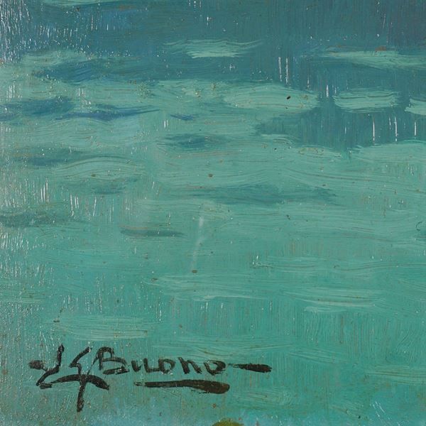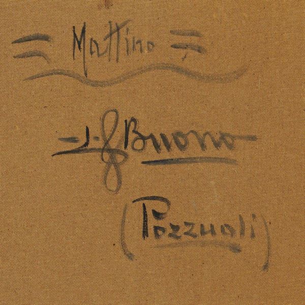 "Mattino", olio su masonite, firmato in basso a sinistra, firmato e intitolato sul retro, entro cornice, 40x50 cm.