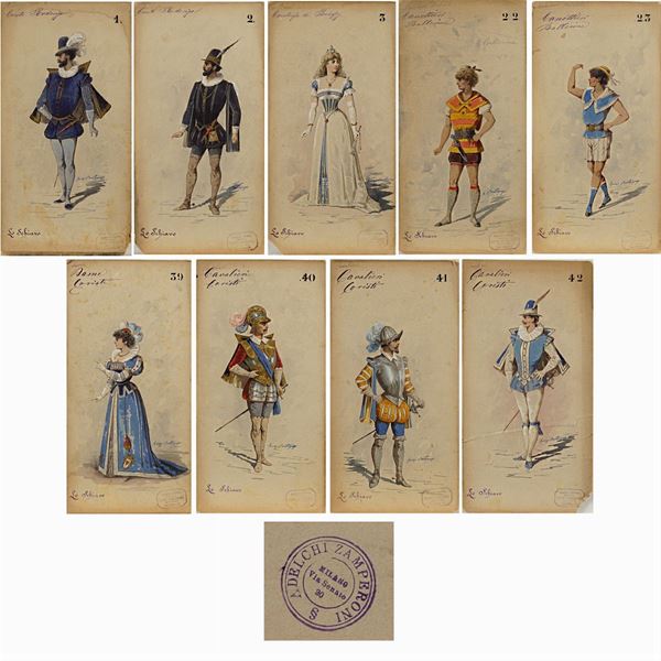 10 figurini per la rappresentazione dell'opera "Schiavo" di Antonio Carlos Gomes, tempera, matita acquarellata e china su cartoncino, annotazioni autografe sul fronte, firmati in basso a destra, timbri de La Premiata Sartoria Teatrale Luigi Zamperoni, Milano, timbri Adelchi Zamperoni sul retro, difetti, 32x16 cm.