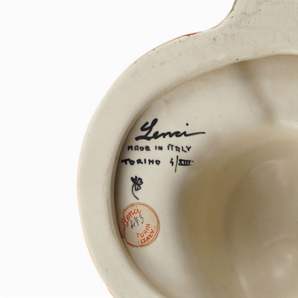 "Madonna Pompeiana", piastra da muro in terracotta maiolicata modellata a colaggio in altorilievo e decorata con smalti policromi pastello, sul retro "Lenci Made in Italy Torino 4/XIII", etichetta Lenci numerata 473, firma sul retro, lievi difetti, 28x18 cm.