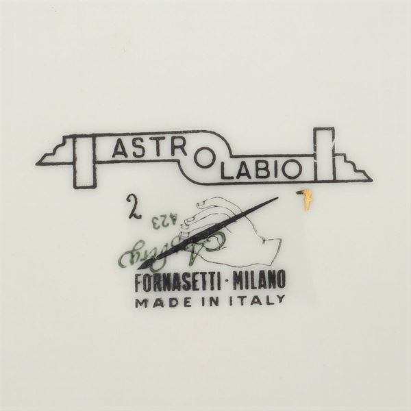 quattro piatti serie "Astrolabio" 1960 circa, in porcellana grisaille profilata in oro, marchio sul retro "Fornasetti - Milano Made in Italy", lievi difetti, d. 24 cm.