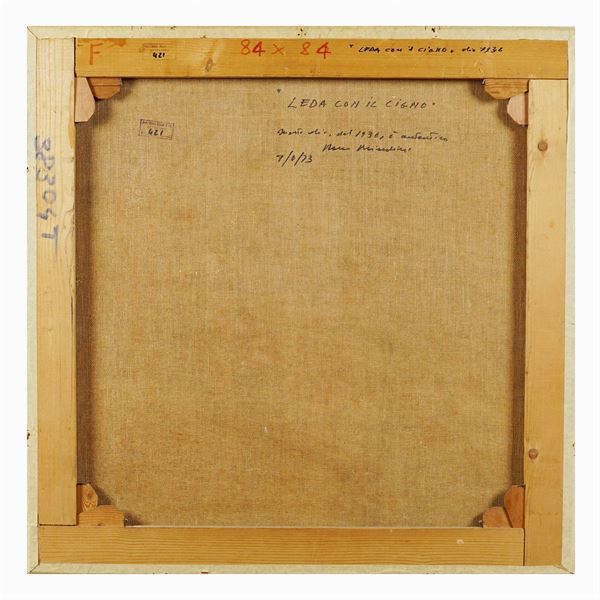 "Leda e il cigno", olio su tela, firmato in basso a destra e sul retro, entro cornice. Certificato di autenticità su fotografia dell' Archivio Remo Brindisi a cura della Galleria Pace, etichetta sul retro con il n. 421 rep. 2953.