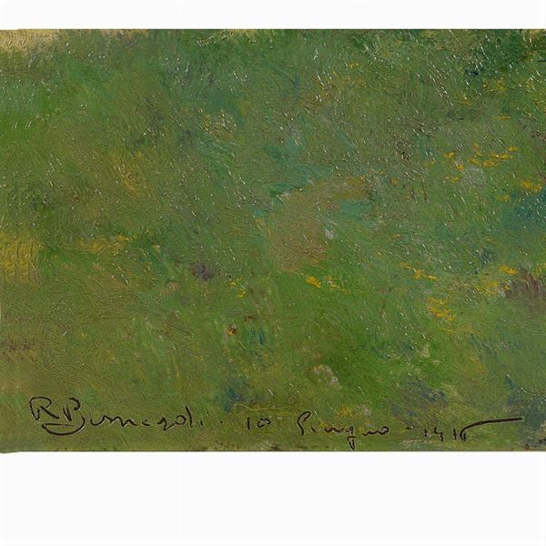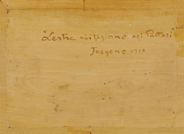 "Abitazione di pastori a Fregene", olio su tavola, firmato e datato 1916 in basso a sinistra, 50x40 cm.