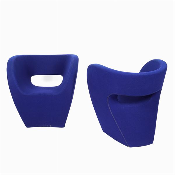 coppia di poltrone, modello "Little Albert", prod. Moroso 2000, struttura in acciaio e poliuretano espanso con rivestimento in tessuto blu, 70x74x60 cm.