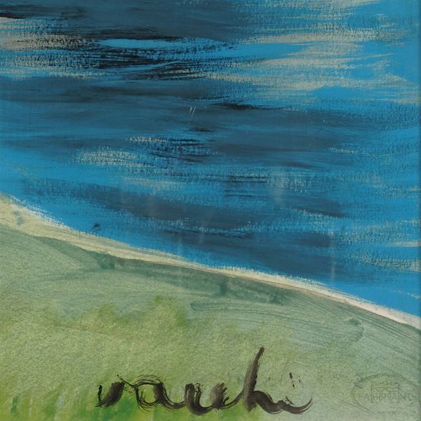 "Paesaggio con tulipani", tecnica mista su carta applicata su tela, firmata in basso a destra, entro cornice. Autentica dell'artista su fotografia, Roma 21-1-1973, 50x70 cm.