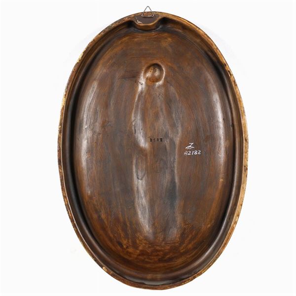 "Madonna con Bambino", placca in ceramica policroma dorata, siglata e numerata al retro, lievi difetti, 43,5x30x4 cm.