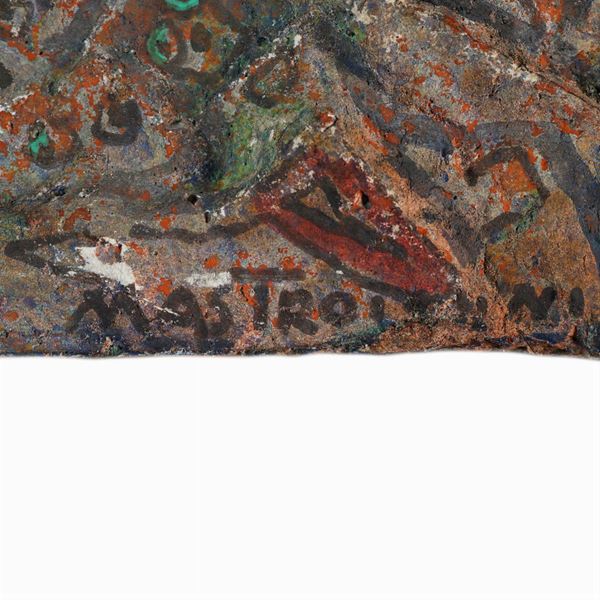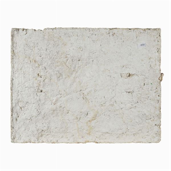 "Composizione", scultura dipinta su cartapesta, firmata in basso a destra, entro cornice, 36x47 cm.