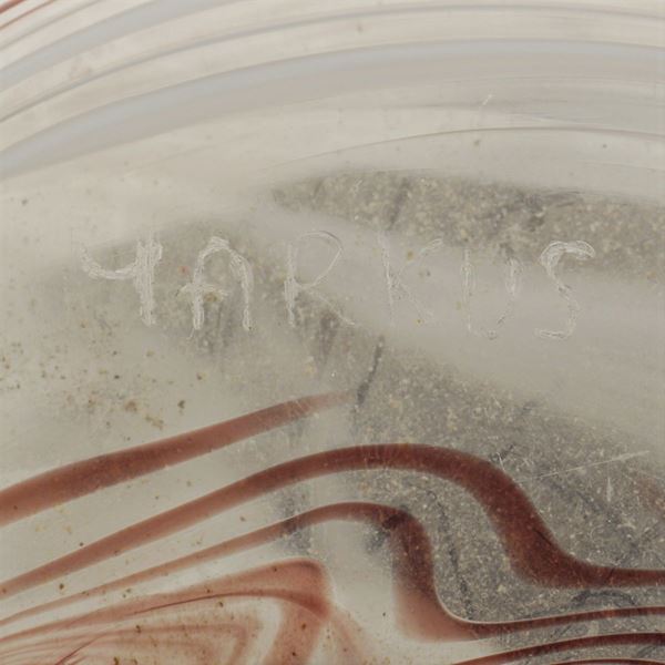 decorato a canne bicolore, etichetta "Vetri Murano", firma incisa sotto la base "Markus", lievi difetti, h. 33 cm.