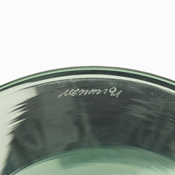 vaso serie "Veronese" 1991, manifattura Venini, in vetro soffiato verde, base circolare, firma e data incisa sotto la base, etichetta "Venini Murano", lievi difetti Bibliografia: a cura di Marino Barovier e Carlo Sonego, Vittorio Zecchin - vetri trasparenti per Cappellin e Venini, Skira, Milano 2017 p. 101, h. 32 cm.