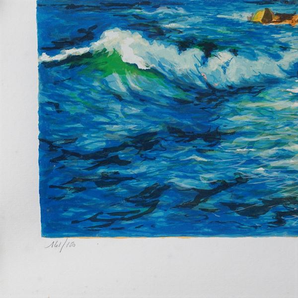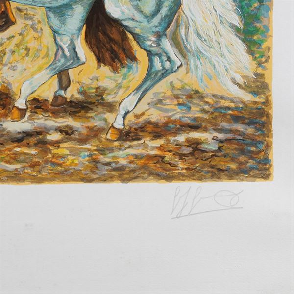 "Corsieri nella costa Brava - 5 Destrieri" litografia, es.141/150, firmata in basso a destra, entro cornice, 100x70 cm.