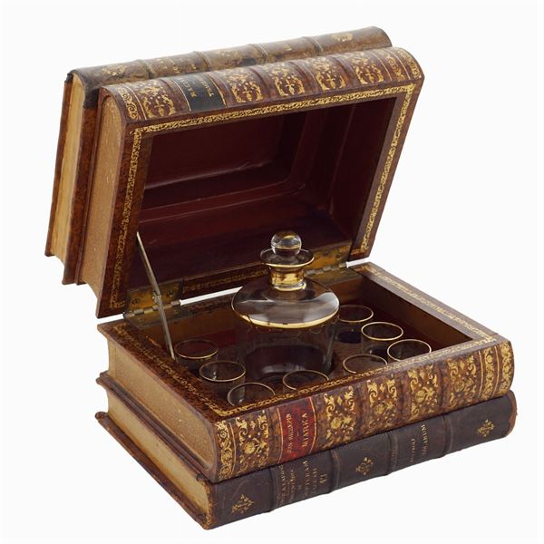 struttura realisticamente decorata in cuoio con finiture in oro a simulare dei libri sovrapposti, all'interno una bottiglia ed otto bicchieri in vetro profilato in oro, lievi difetti, 21x28x19 cm.