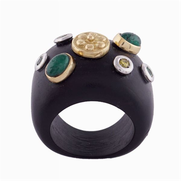 impreziosito da elementi in oro giallo e bianco 18kt, smeraldi taglio cabochon, di cui uno con difetti, e zaffiri gialli misura 16, peso 8,8 gr.