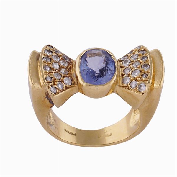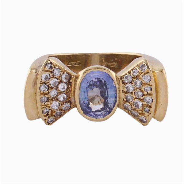 zaffiro taglio ovale briolet ai lati diamanti taglio huit-huit ct 0,50 circa, misura 13, peso 11,6 gr.