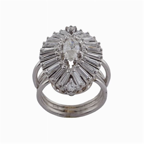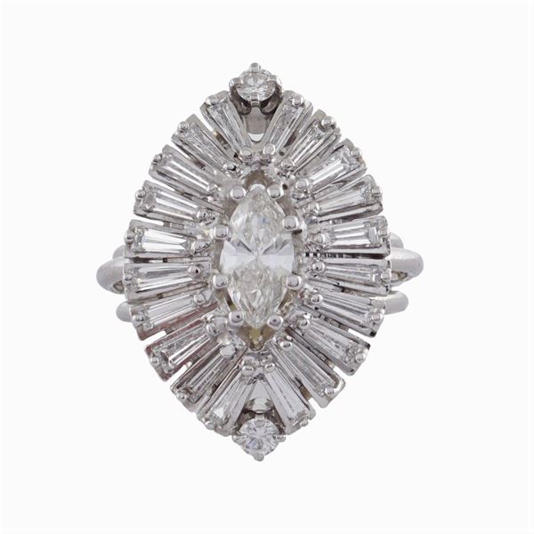 un diamante taglio marquise ct 0,70 circa, contornato da diamanti taglio tapered e brillante ct 1.75 circa, misura 12, peso 10 gr.
