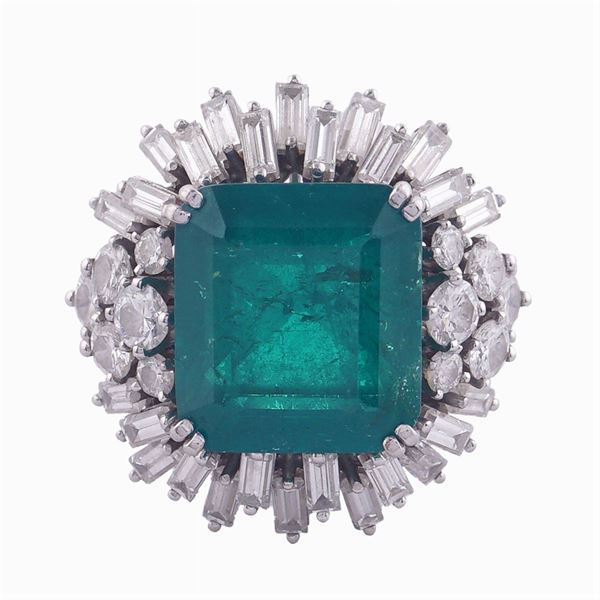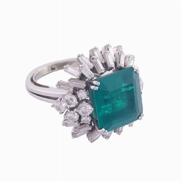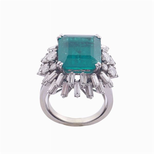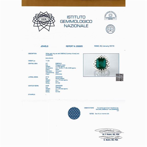 circa, taglio ottagonale a gradini montato in oro bianco 18kt contornato da diamanti taglio brillante ct 1,10 circa colore G/H - purezza IF/VVS e diamanti taglio baguette ct 1,40 circa colore G/H - purezza IF/VVS, misura 12, completo di certificato gemmologico I.G.N n. 26885, peso 11,34 gr.