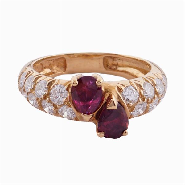 taglio brillante ct 0,60 circa, al centro due rubini taglio a goccia ct 0,70 circa, misura 8, peso 3,5 gr.