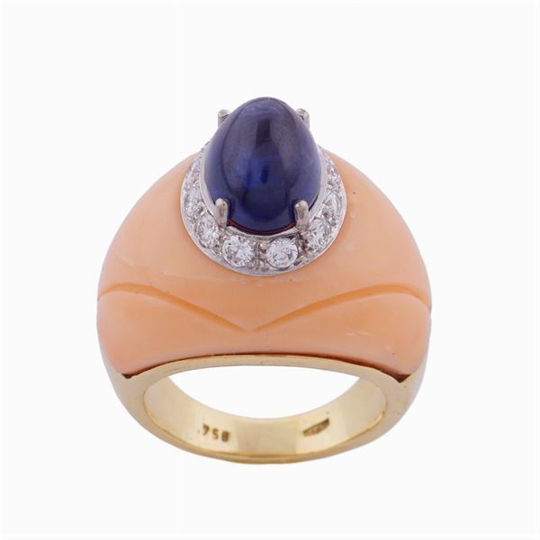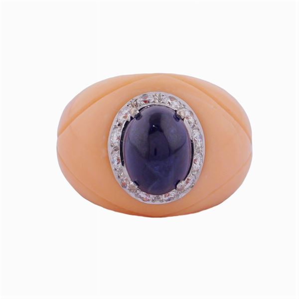 taglio cabochon ct 4 circa contornato da diamanti taglio brillante ct 0,50 circa, incastonato in una sezione di corallo rosa, lievi difetti, misura 13, peso 16,2 gr.