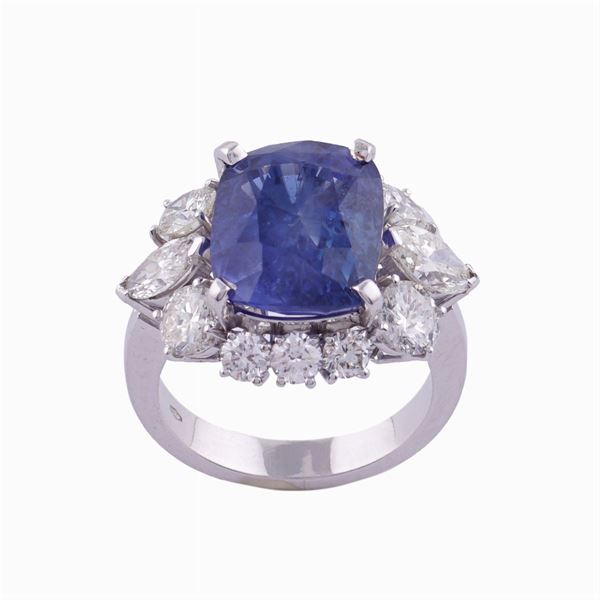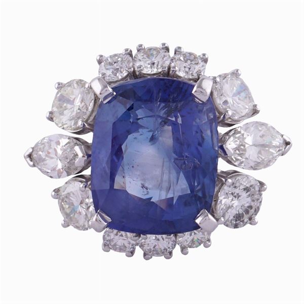contornato da diamanti taglio brillante e navettes ct 3 circa, misura 15, completo di certificato gemmologico EG Lab n. 41326, peso 10,3 gr.