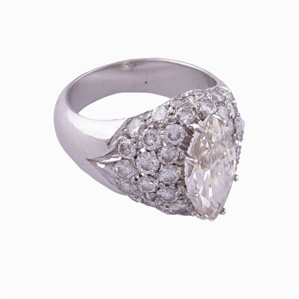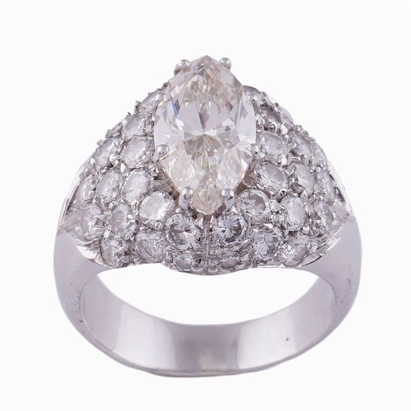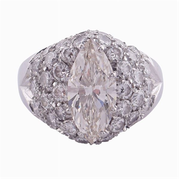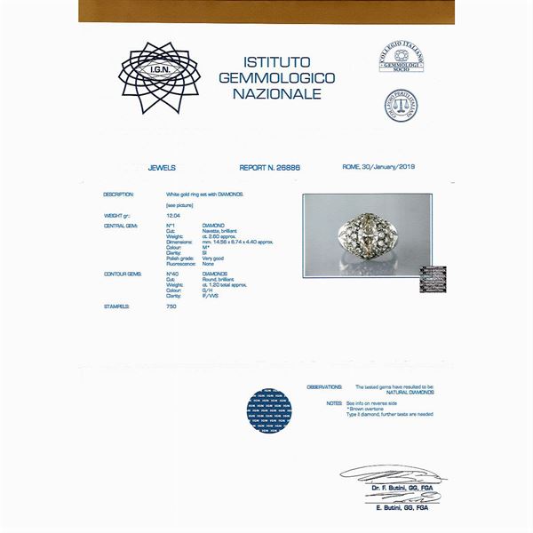 taglio navette ct 2,60 circa colore M - purezza SI, contornato da diamanti taglio brillante ct 1,20 circa colore G/H - purezza IF/VVS, misura 14, completo di certificato gemmologico I.G.N n. 26886, peso 12,04 gr.