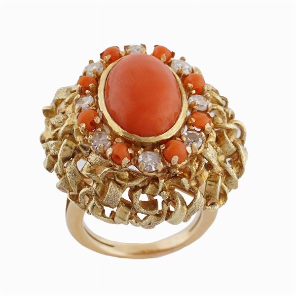 taglio ovale cabochon contornato da diamanti taglio brillante antico ct 0,35 circa, alternati a piccoli coralli a sfera, misura 8