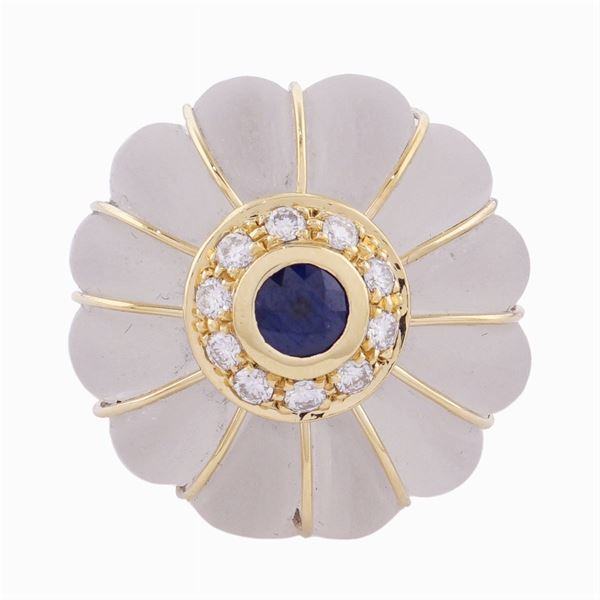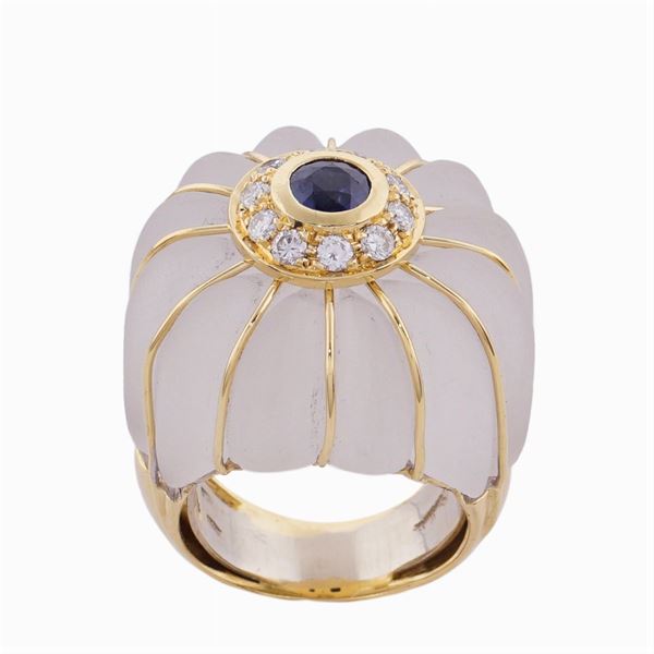 tagliato a melone, al centro zaffiro tondo ct 0,50 circa contornato da diamanti taglio brillante ct 0,40 circa, misura 13,5, peso 31 gr.
