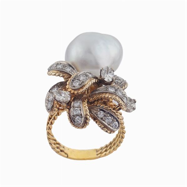lavorato a cordoncino con perla scaramazza 13x16 mm. circa e diamanti taglio brillante e navettes ct 0,80 circa, misura 12, peso 11 gr.
